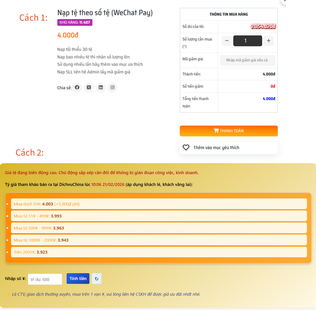 Cách 2: Mua nhanh tại đây, (không cần đăng ký, nạp tối thiểu được 1 tệ) bằng cách nhập số tệ cần mua vào sau đó nhấn "Tính tiền" hệ thống tự tính toán số tiền và mã QR thanh toán nhanh.